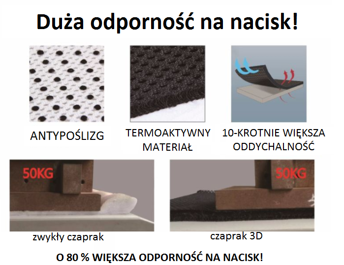 Prezentujemy czaprak nowej generacji, firmy LEONARDO, wykonany w technologii 3D. Posiada antypoślizgowy grip pod siodłem oraz amortyzujące komory powietrzne. Dopasowuje się do anatomii konia oraz do siodła, dzięki czemu w znacznym stopniu zmniejsza ryzyko uszkodzenia kręgosłupa oraz zapalenia mięśni, spowodowane np. źle dopasowanym siodłem. Działa termoaktywnie, idealnie odprowadza pot i oddycha 10-krotnie lepiej niż zwykły czaprak. Jest o 80% bardziej odporny na nacisk, dzięki czemu nadaje się dla każdego konia oraz jeźdźca, chroniąc kręgosłup i dając ulgę.